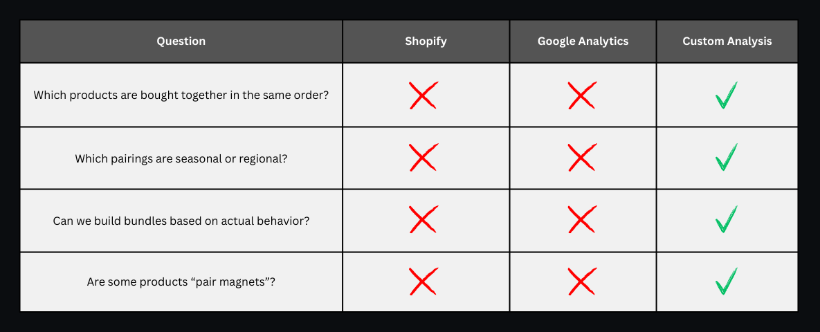 While Shopify and Google Analytics are powerful for top-level performance monitoring, they fall short when it comes to uncovering nuanced customer behavior like product pairings and natural bundling opportunities.