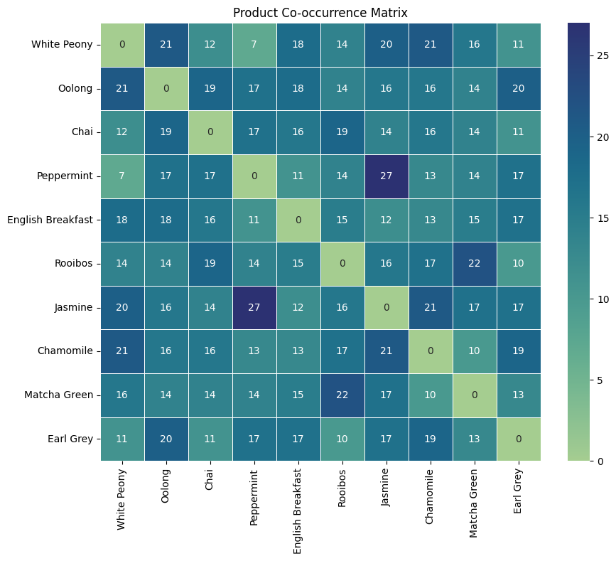 Using raw order-level data from Shopify (exported into a clean database), we built a co-occurrence matrix (i.e. a product affinity matrix). Each cell in the matrix represented how many times two specific tea products appeared in the same order.